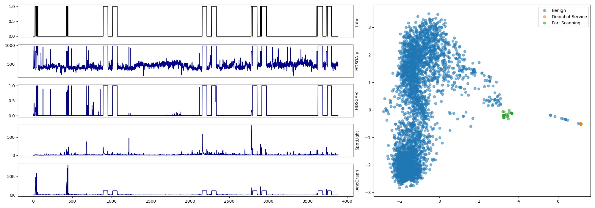 Left: Anomaly detection results on SIMARGL dataset showing ground truth (top row) and detection scores from various methods. Right: 2D projection (PCA) of binary encodings showing how different attack types (DoS, port scanning) cluster separately from benign traffic.