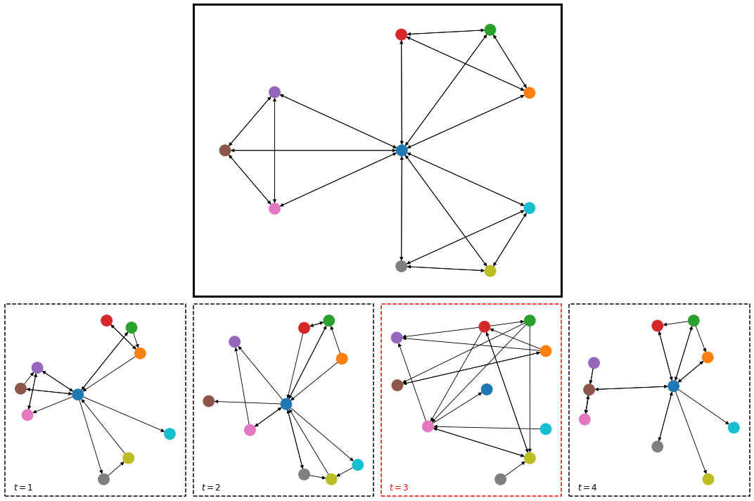 Example of anomaly detection in graph snapshots. The sequence shows snapshots sampled from an underlying windmill graph (t=1, 2, 4). At t=3, the snapshot is sampled from a complete graph and is therefore anomalous.